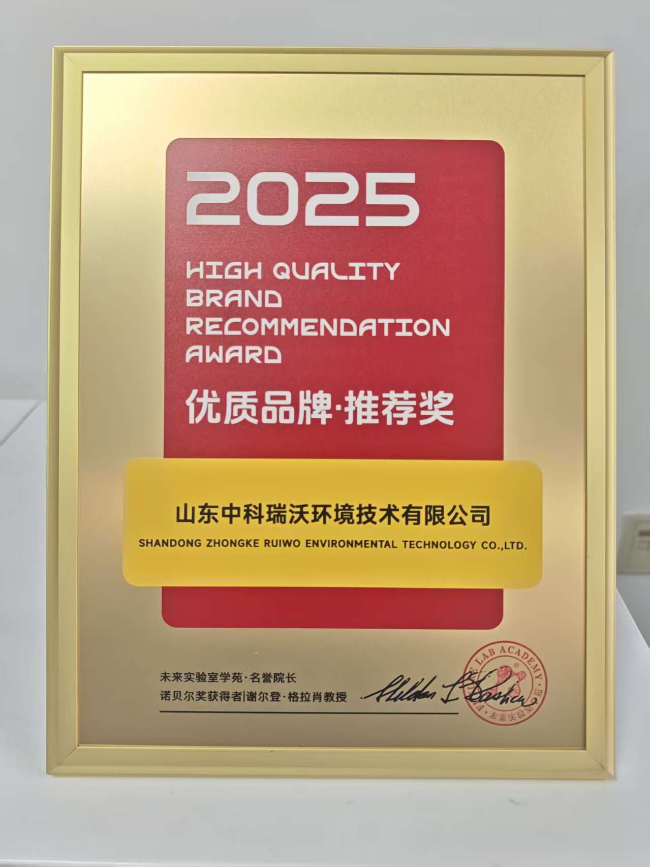 2025年4月10日,山東中科瑞沃環境技術有限公司在2025未來實驗室創新與發展大會暨第十屆未來實驗室建設與裝備展覽交易會上,旗下“中科瑞沃”品牌喜獲未來實驗室學苑·名譽院長、諾貝爾獎獲得者:謝爾登·格拉肖教授頒發的《優質品牌推薦獎》。